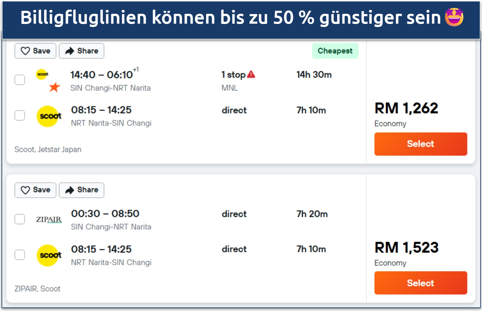Billigfluglinien bieten viel günstigere Flüge als die großen Fluggesellschaften an. Das gilt insbesondere, wenn es sich um regionale Fluggesellschaften handelt. Vor allem bei Kurzstreckenflügen findest Du häufig viel niedrigere Grundpreise. Der Nachteil ist, dass Du normalerweise für die gleiche Menge an Gepäck oder anderen Annehmlichkeiten mehr bezahlen musst. ANA und JAL verlangen für einen Flug zwischen Singapur und Tokio etwa mehr als 500 $. Billigflieger wie Scoot und Zipair boten hingegen für die gleiche Route Flüge für unter 400 $ an.